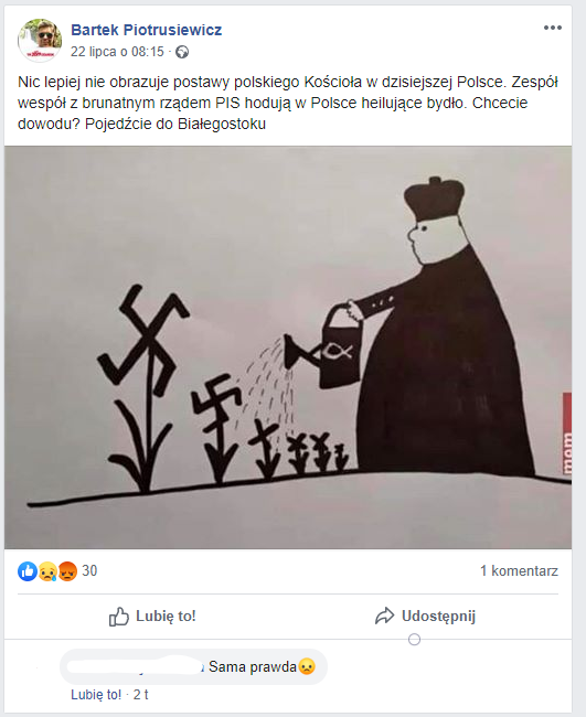 – Nic lepiej nie obrazuje nie obrazuje postawy kościoła w dzisiejszej Polsce. Zespół wespół z brunatnym rządem PiS hodują w Polsce heilujące bydło. Chcecie dowodu? Pojedźcie do Białegostoku – w tych słowach komentował podlaski Marsz Równości.