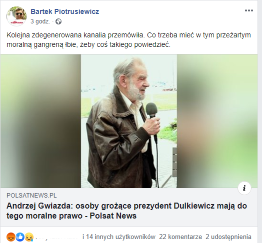– Kolejna zdegenerowana kanalia przemówiła. Co trzeba mieć w tym przeżartym moralną gangreną łbie, żeby coś takiego powiedzieć – napisał komentując słowa Andrzeja Gwiazdy.