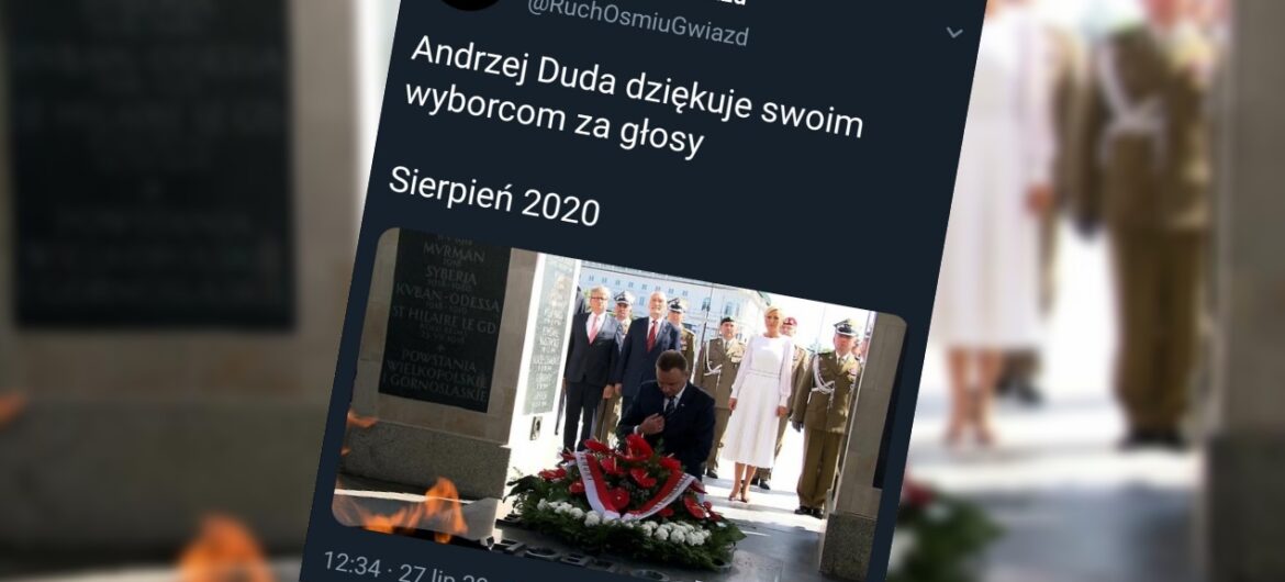 “Andrzej Duda dziękuje swoim wyborcom za głosy. Sierpień 2020” – brzmi treść skandalicznego tweeta Ruchu Ośmiu Gwiazd, do którego zostało załączone zdjęcie Andrzeja Dudy składającego kwiaty pod Grobem Nieznanego Żołnierza w ramach święta Wojska Polskiego, obchodzonego co roku 15 sierpnia. Najprawdopodobniej autorzy profilu zauważyli spadającą na nich lawinę krytyki, dlatego też postanowili finalnie usunąć post. Jego zdjęcia zostały jednak zachowane przez internautów.