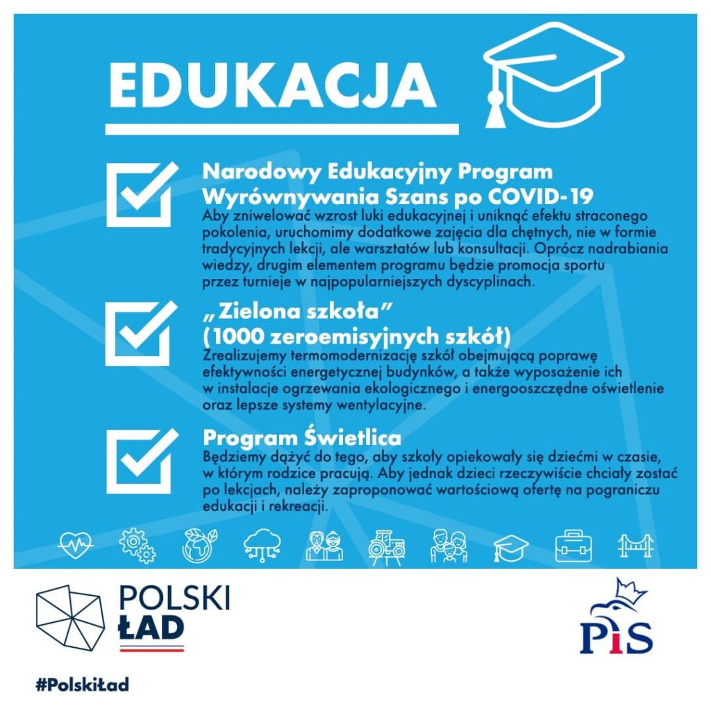 Rządzący planują „zniwelować luki edukacyjne i uniknąć efektu straconego pokolenia”. W tym celu zostaną uruchomione dodatkowe zajęcia dla chętnych w formie warsztatów lub konsultacji. Polskie szkoły mogą liczyć na pomoc w termomodernizacji i poprawy działań proekologicznych.
