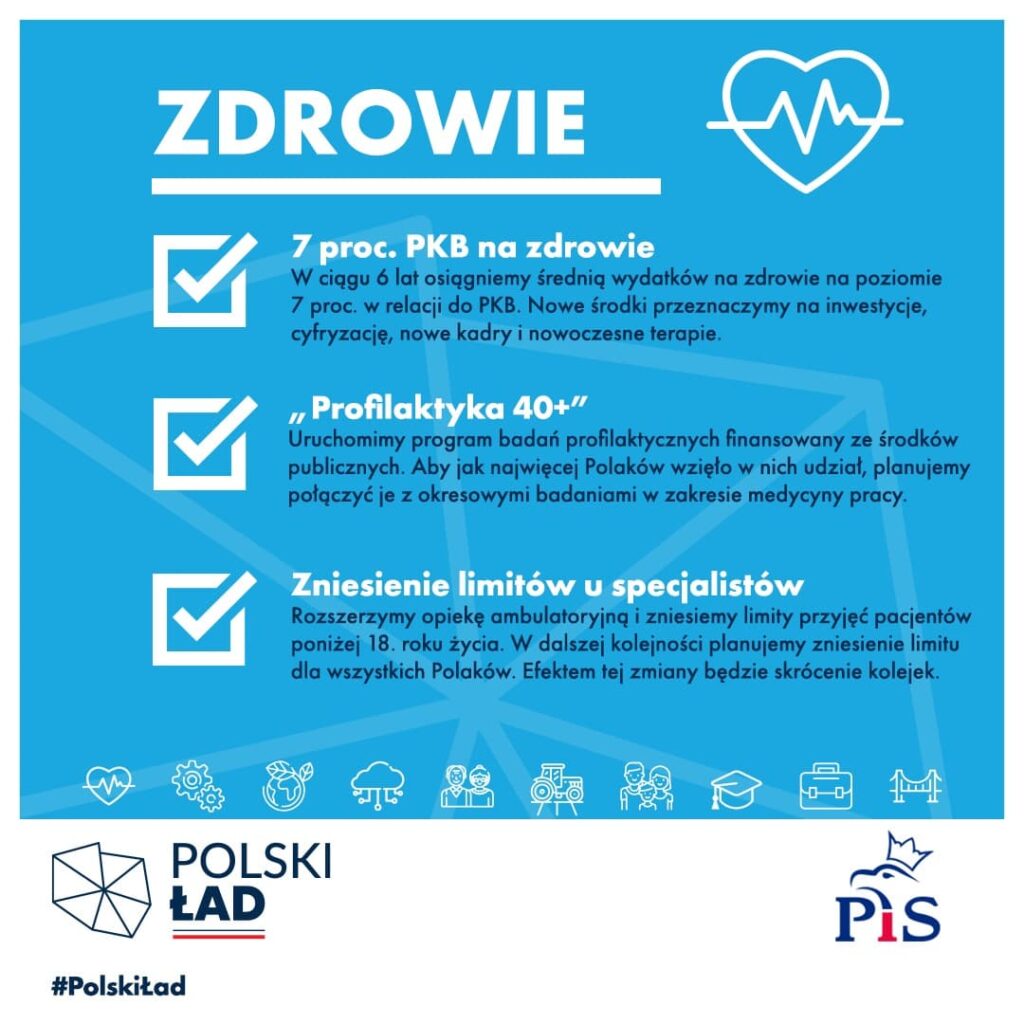 Jednym z głównych założeń programu jest zwiększenie wydatków na zdrowie do 7 proc. PKB. Prezes PiS podkreślił, że w 2023 r. osiągną one 6 proc. PKB. Kolejnym elementem programu jest inwestycje, które generować będą 500 tys. nowych miejsc pracy.