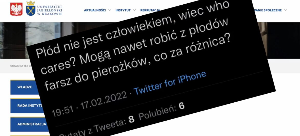 ❗️ @JagiellonskiUni – proszę o informację, czy osoba która pisze o robieniu „farszu do pierożków” z płodów ludzkich powinna być Rzecznikiem Prasowym Instytutu Psychologii Waszego Uniwersytetu. pic.twitter.com/qNsLiUhIBE