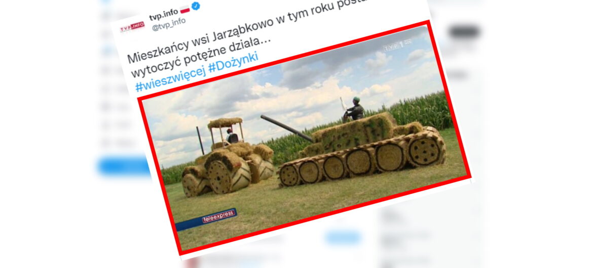 Takich dożynek jeszcze nie było. Rolnicy z Wielkopolski postanowili w tym roku wytoczyć naprawdę “potężne działa” – donosi Teleexpress. W hołdzie dla czynu zbrojnego Ukraińców, a przede wszystkim ukraińskich rolników, przygotowali nietypową dekorację. Trzeba przyznać, że udało im się zabłysnąć kreatywnością i humorem – w dodatku w słusznej sprawie.