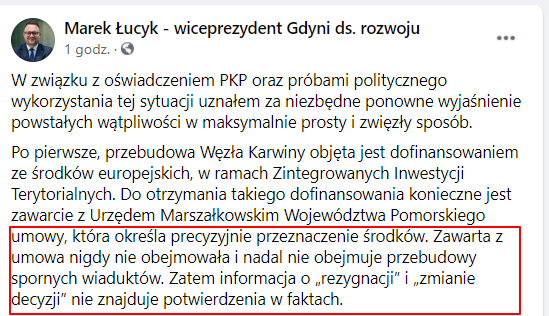 – Zawarta umowa nigdy nie obejmowała i nadal nie obejmuje przebudowy spornych wiaduktów. Zatem informacja o „rezygnacji” i „zmianie decyzji” nie znajduje potwierdzenia w faktach – informował wiceprezydent odnosząc się do komunikatu PKP.