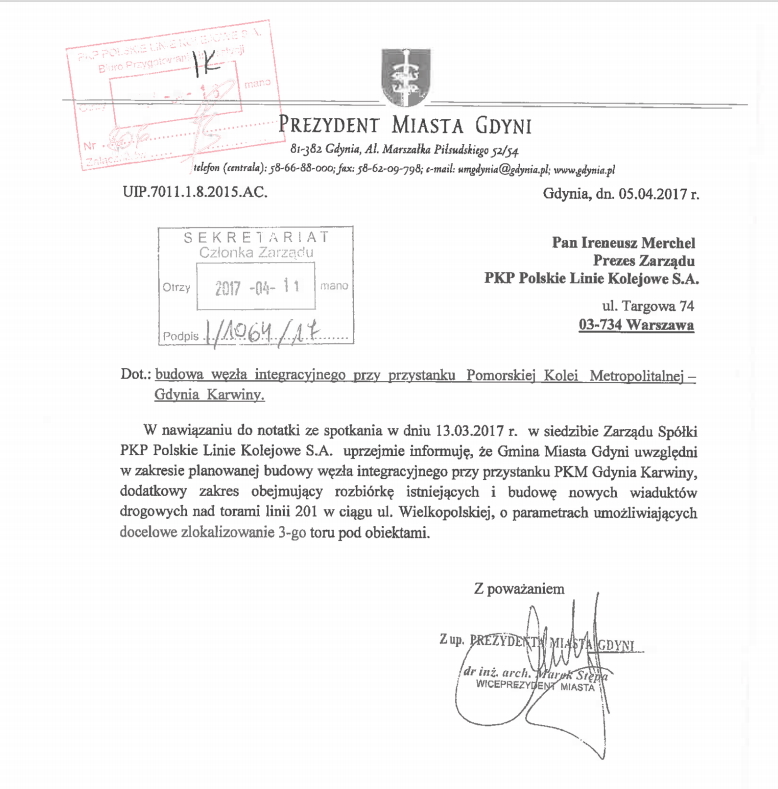 – W nawiązaniu do notatki ze spotkania w dniu 13.03.2017 roku w siedzibie Zarządu Spółki PKP PLK S.A uprzejmie informuję, że Gmina Miasta Gdyni uwzględni w zakresie planowanej budowy węzła integracyjnego (…) dodatkowy zakres obejmujący rozbiórkę istniejących i budowę nowych wiaduktów drogowych nad torami linii 201 w ciągu ul. Wielkopolskiej, o parametrach umożliwiających docelowe zlokalizowanie 3-go toru pod obiektami – czytamy w dokumencie z 5 kwietnia 2017 roku, pod którym widać podpis ówczesnego wiceprezydenta miasta Marka Stępy.